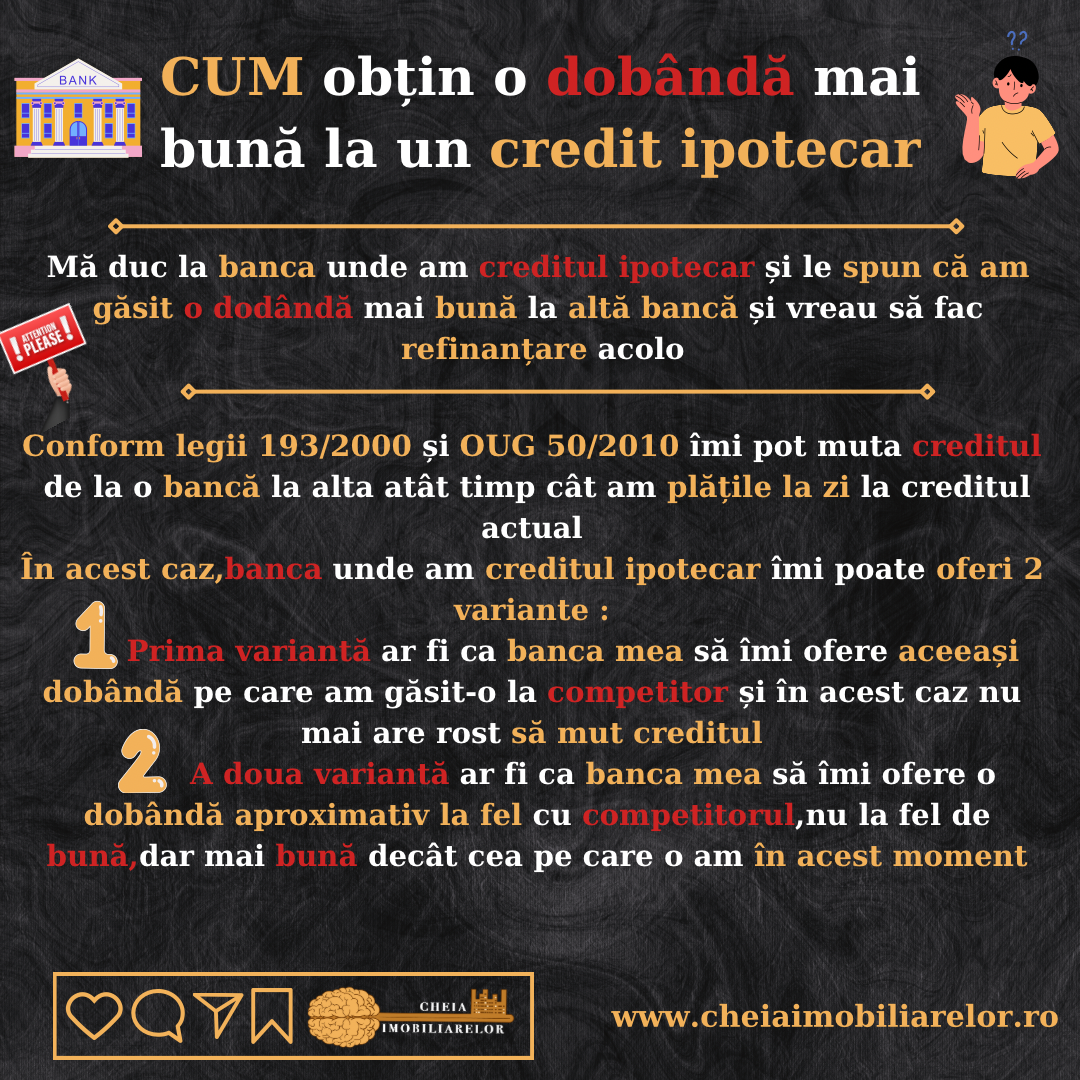 O altă opțiune este să negociezi cu banca ta actuală pentru a obține o dobândă mai bună. Poți aborda banca și să le spui că ai găsit o ofertă mai avantajoasă la o altă instituție financiară și ești interesat să faci o refinanțare.
